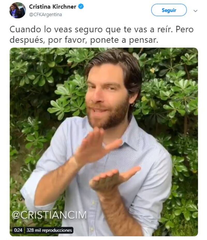 "Cuando lo veas seguro que te vas a reír. Pero después, por favor, ponete a pensar", tuiteó Cristina Kirchner, ahora candidata a vicepresidente por el Frente de Todos que lidera Alberto Fernández. Cristina compartió el tuit y su respecto video ayer por la tarde cuando aún faltaban varias horas para el debate. Inmediatamente se volvió viral y logró recolectar 9.625 Retweets y 21.967 Me gusta.