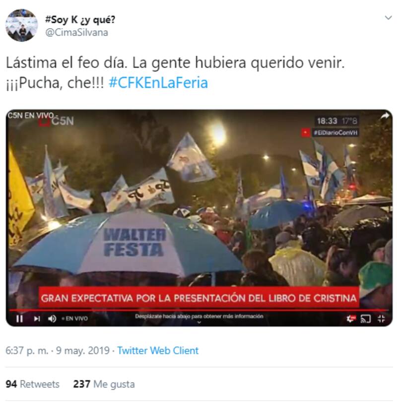 Además, hay dos videos que marcaron la jornada y mostraron el ánimo de quienes se acercaron a escuchar a Fernández, con una muestra de lo que sucedía a la salida, en la estación de subterráneo Plaza Italia, pegada a la Feria; y la cantidad de personas que iban leyendo el libro de CFK a la vuelta del acto, en un vagón de la línea Urquiza de ferrocarriles.