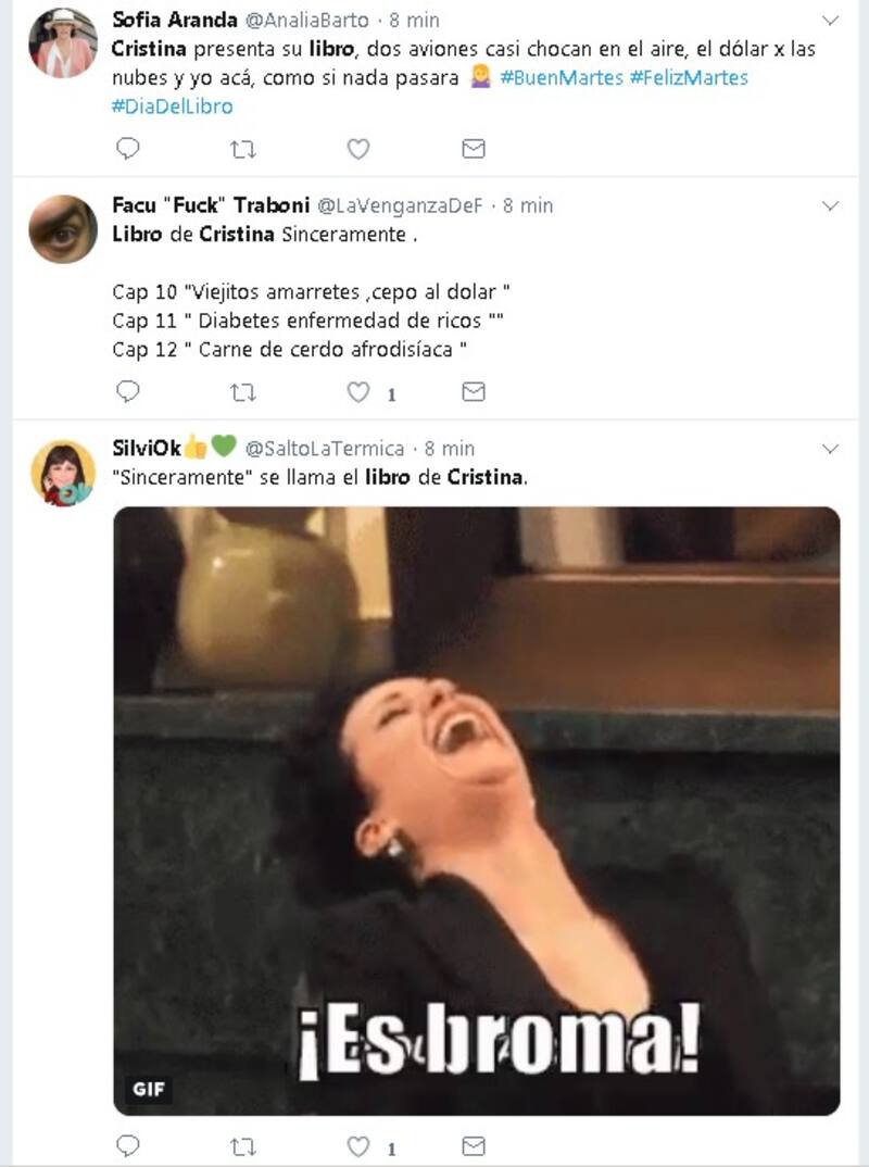 Sofía menciona todo lo que pasa hoy martes (aviones que casi chocan, cotización del dólar, por ejemplo) para luego cerrar con una mención el Día del Libro. Y Facundo directamente cita frases dichas por Fernández durante su presidencia. Silvi, directamente, se burla del título elegido, "Sinceramente", irónico en su visión (presumiblemente por las acusaciones de corrupción).