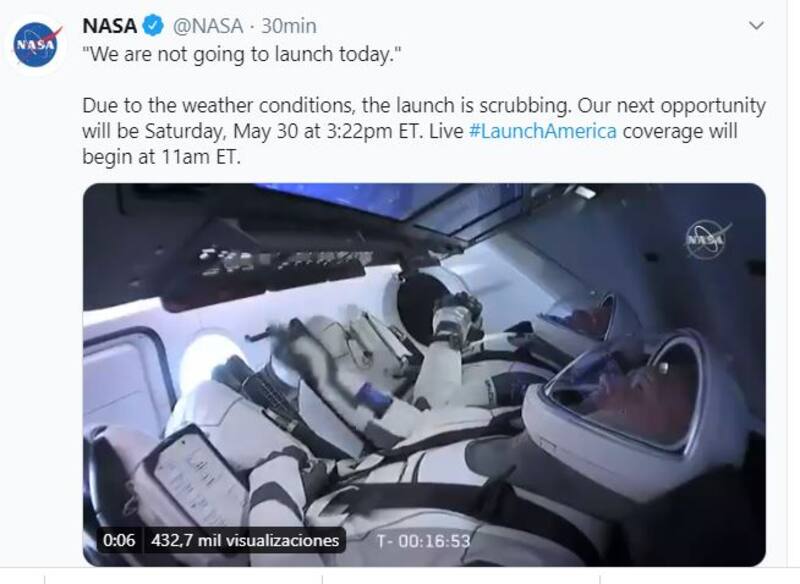 La misión de prueba, denominada Demo-2 yliderada por dos astronautas, fue suspendida por mal tiempo y se realizaría, en principio, el próximo sábado 30 de mayo.