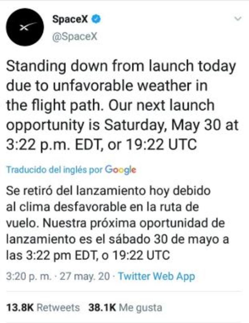 El despegue tuvo que postergarse por condiciones climatológicas adversas, confirmó SpaceX desde su cuenta oficial de Twitter.