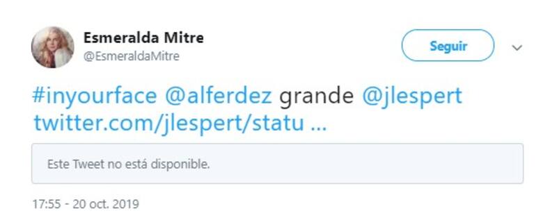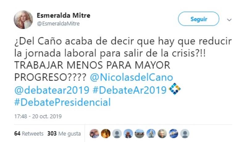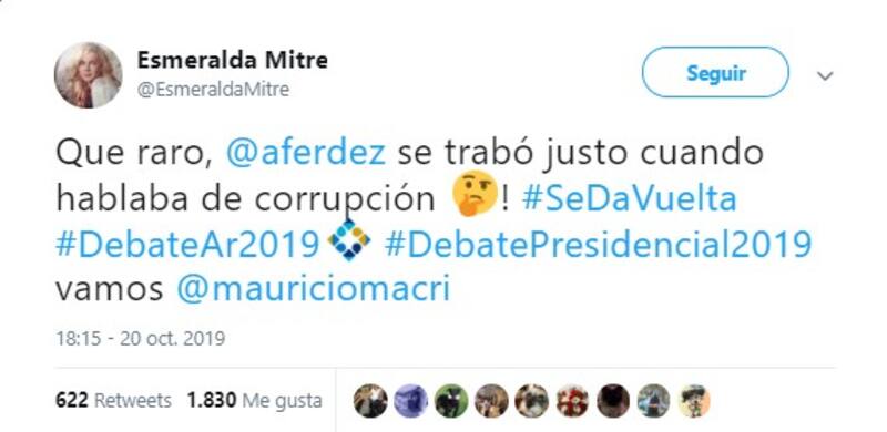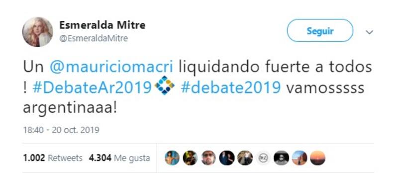Por su parte, la actriz Esmeralda Mitre (@EsmeraldaMitre) también mostró su particular visión sobre el debate presidencial. Destacó la participación de Macri, castigó a Alberto Fernández, felicitó a Espert y fue sarcástica con Nicolás del Caño.