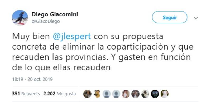 Milei también retuiteó un posteo de su colega Diego Giacomini en el cual elogió la postura de Espert en el debate.