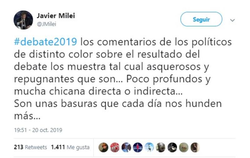 Por su parte, Milei (@JMilei), en el tono confrontativo que lo caracteriza, también posteo mientras se producía el debate presidencial.