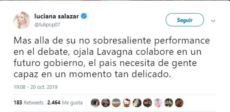 Salazar, por ejemplo, en su cuenta de Twitter (@lulipop07) se mostró muy activa: elogió a Alberto Fernández, cuestionó a Mauricio Macri, criticó a José Luis Espert, y destacó la participación de Roberto Lavagna en el debate.