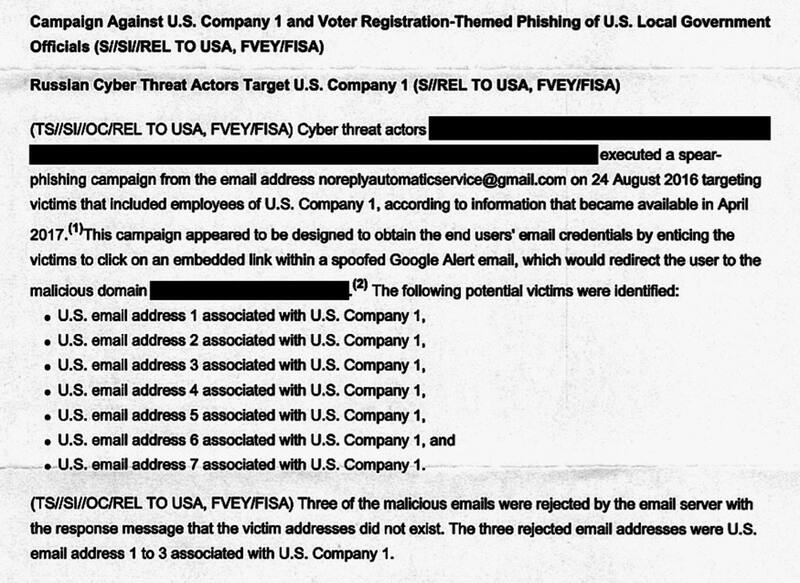 Aún cuando no hay nada absolutamente confirmado, toda la evidencia parece apuntar a que la inteligencia rusa jugó un papel esencial en las elecciones presidenciales de los Estados Unidos. Una reciente filtración, por parte de un "insider", de documentos secretos por parte de la NSA (la Agencia Nacional de Seguridad de los Estados Unidos), apunta a que desde Moscú se habrían enviado cerca de 100 emails a una de las empresas proveedoras de tecnología para el proceso electoral con links maliciosos de phishing.