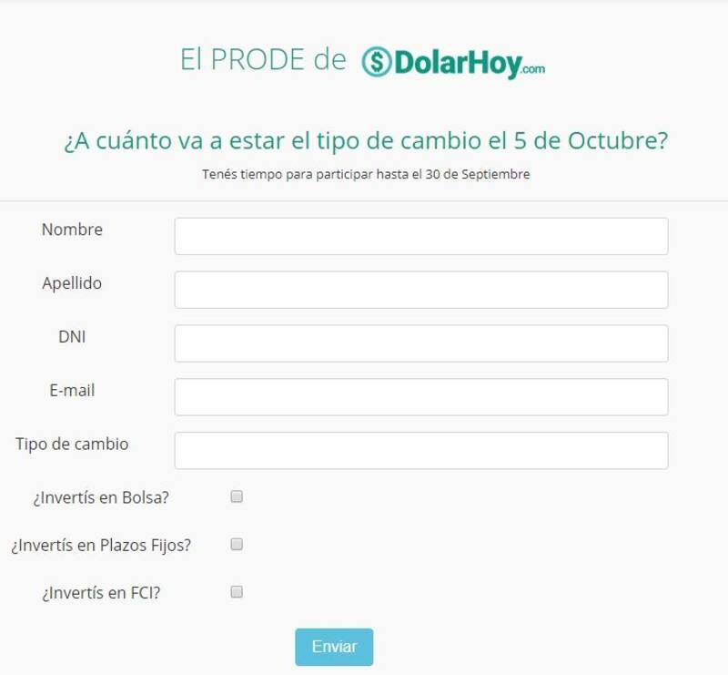 El sitio web Dolar Hoy, que provee información sobre la cotización del real, el euro y el peso chileno, entre otros, lanzó el prode del dólar. El sorteo consiste en realizar un “pronóstico del precio de dólar en una fecha específica: el 5 de Octubre.