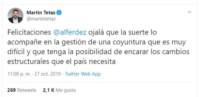 Más allá de todos los análisis, anoche el economista felicitó al presidente electo a través de Twitter.