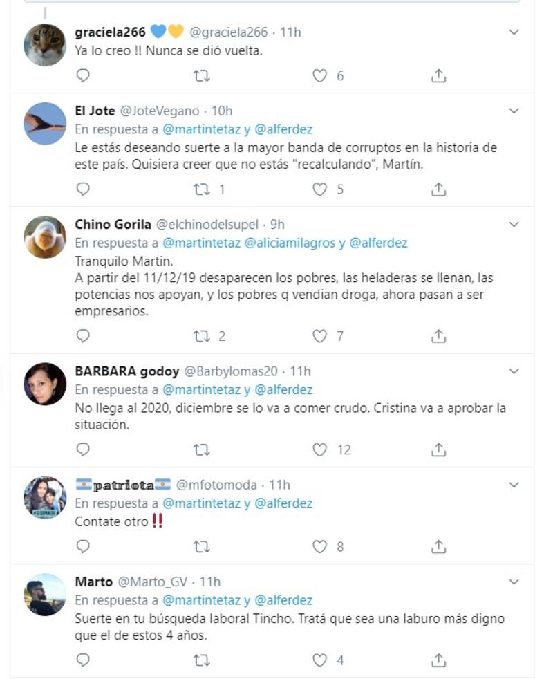 Las respuestas no se hicieron esperar, la mayoría insultándolo de una manera u otra, diciendo que ya estaba buscando trabajo o señalándole los "pecados" del nuevo presidente.