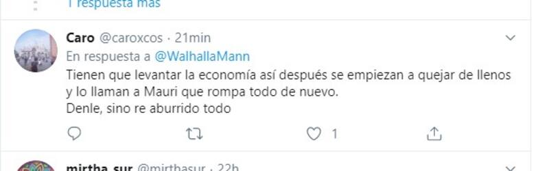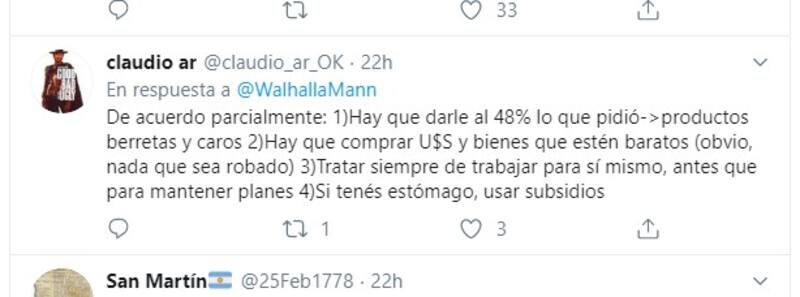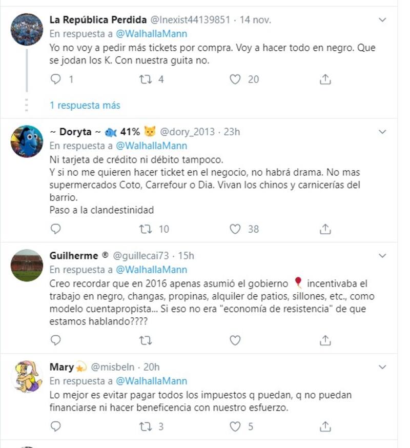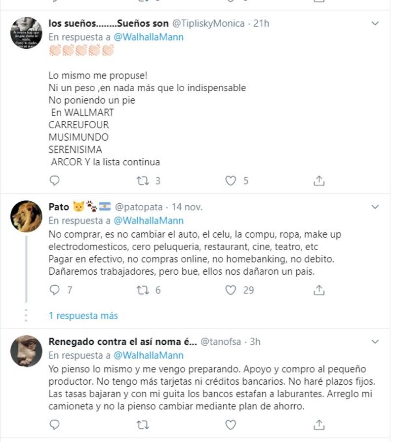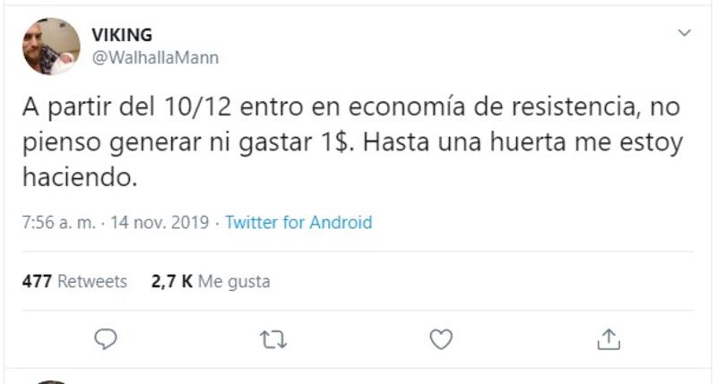 No es el primer tuit al respecto pero es uno de los más virales, con más de 2,7 me gusta y cientos de retuits. El tuitero @WalhallaMann, conocido por su militancia digital por el gobierno de Mauricio Macri -y por su trabajo como "armador" de picadas VIP-, posteó: "A partir del 10/12 entro en economía de resistencia, no pienso generar ni gastar 1$. Hasta una huerta me estoy haciendo".