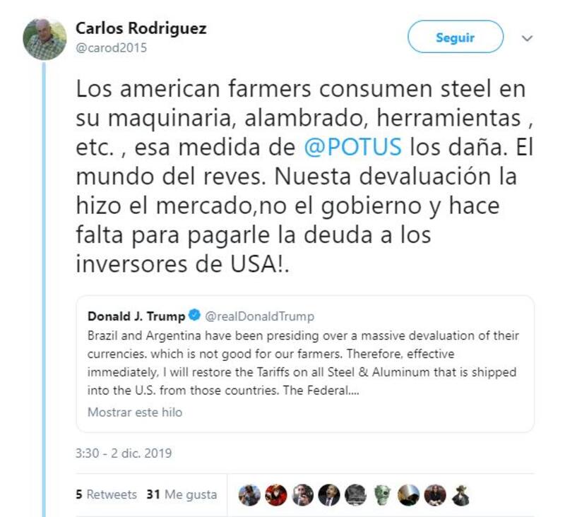 El anuncio de Trump sorprendió a muchos ya que llegó por redes sociales. En este sentido, fueron varios los economistas argentinos que se sumaron a la voz social en la plataforma Twitter.