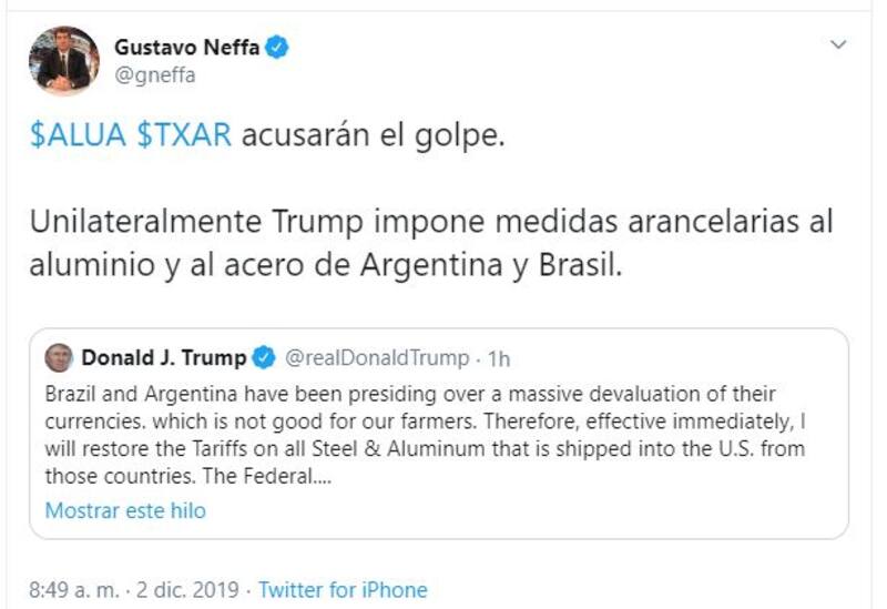 A pocos minutos de las 8 de la mañana, el presidente de los Estados Unidos Donald Trump anunció medidas arancealarias para la Argentina. Las exportaciones de acero y aluminio desde Brasil y la Argentina hacia los Estados Unidos volverán a ser gravadas con tarifas. Así lo anunció Trump en dos mensajes escritos en la red social Twitter.
