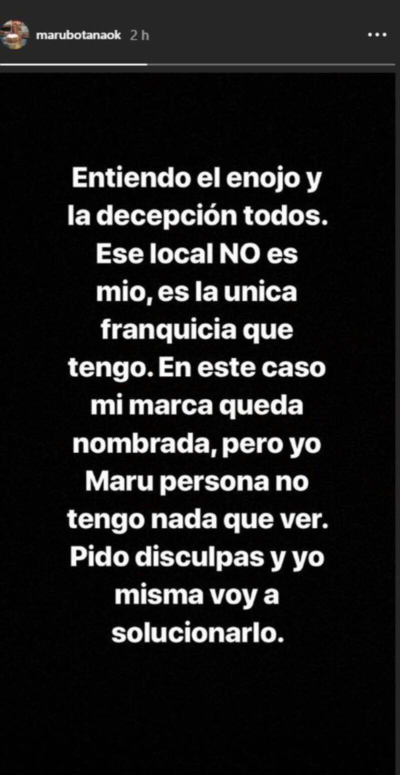 "Entiendo el enojo y la decepción de todos. Ese local NO es mío, es la única franquicia que tengo. En este caso mi marca queda nombrada, pero yo Maru Botana, no tengo nada que ver. Pido disculpas y yo misma voy a solucionarlo", sentenció.