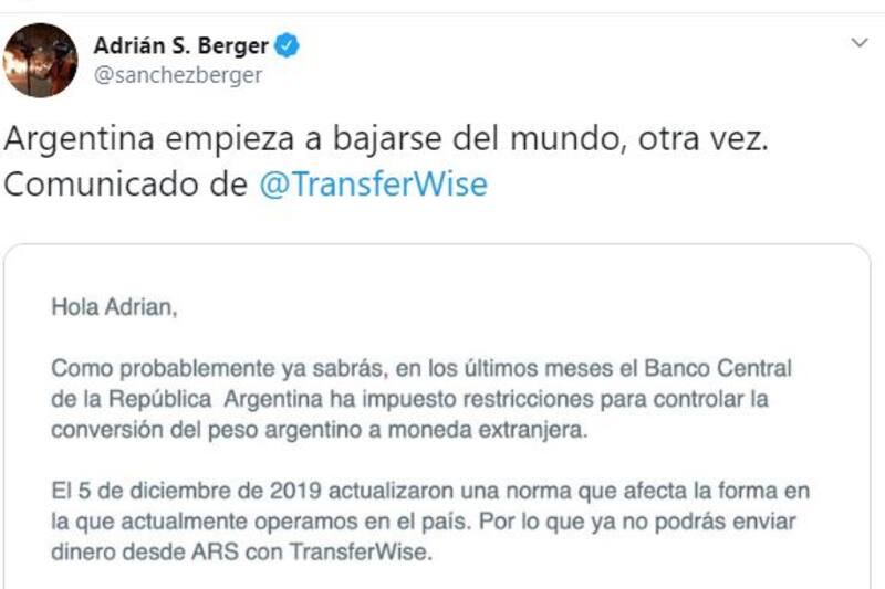 Otro usuario denuncio tener sus peso "congelados" en la aplicación. Aunque desde la empresa confirmaron que se podía convertir el saldo en pesos a dólares. A su vez, la empresa volvió a decir que el problema se debe a la normativa del Banco Central y que esperan que "se solucione pronto".