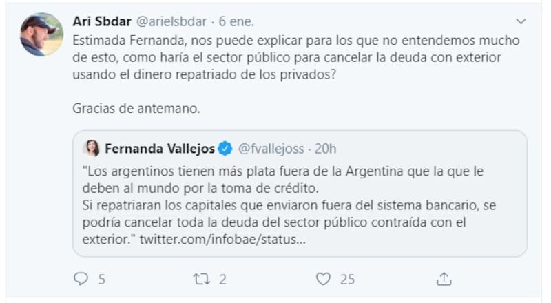 "Los argentinos tienen más plata fuera de la Argentina que la que le deben al mundo por la toma de crédito. Si repatriaran los capitales que enviaron fuera del sistema bancario, se podría cancelar toda la deuda del sector público contraída con el exterior", escribió Vallejos.