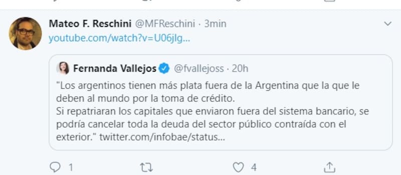 Aquellos que opinaron sobre la publicación entendieron que la diputada hizo una propuesta concreta. Sin embargo, en realidad estaba citando los primeros párrafos de una nota publicada en el portal Infobae sobre que "la salida de capitales alcanzó un récord de USD 322.000 millones y superó a la deuda pública" y se trataba de una comparación que hace el periodista Juan Gasalla al inicio de su nota.