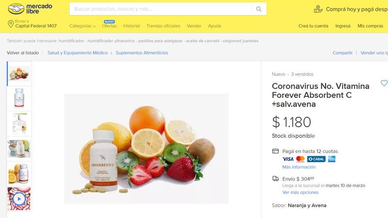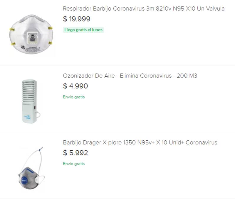 Sin embargo, basta colocar "coronavirus" en el buscador de Mercado Libre para encontrar más de 10 páginas con ofertas de productos como "barbijo prevención coronavirus"; "vitaminas que previenen el coronavirus" y "ozonizador de aire que previene el coronavirus".