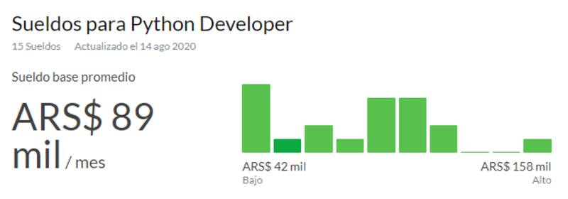 Python tiene conceptos claves como variables, estructuras y operadores que son bastante fáciles a comparación de otros lenguajes como Java. En las primeras unidades del curso se aprenderá OOP (programación orientada a objetos), expresiones comunes en Python, estructuras y funciones. Es clave hacer hincapié en entender correctamente OOP ya que es la base de muchas aplicaciones complejas. Análisis de datos, Django, Flask y automatización son algunos de los tópicos tratados en los cursos. Según el sitio de sueldos Glassdoor, un desarrollador Python gana entre $42 mil y $158 mil al mes.