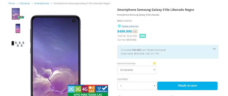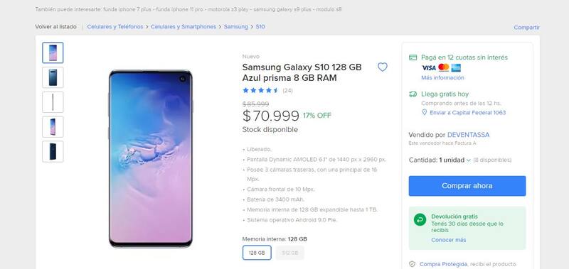 Un celular gama alta (Samsung S10) se consigue en la misma tienda chilena por $ 499.990. Convertido a peso argentino, son $ 39.436. Si a este precio se le suma la alícuota del dólar turista, el precio final queda en $ 51.266 ($ 11.830 de impuestos y $ 39.436 del precio del producto).