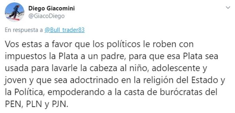 “(La Universidad) La pagamos entre todos, inclusive los que no estamos de acuerdo, los que no la usan, los que no terminarán y nunca terminaron secundaria y primaria , añadió Giacomini.