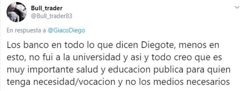“Garrafal que desde la misma Universidad se desinforme y engañe a la población. Nada es gratis, no existe la universidad gratis , sostuvo el economista Diego Giacomini desde su cuenta personal en la red de microblogging @GiacoDiego y adjuntó un video promocional realizado por la casa de altos estudios para conmemorar su aniversario número 70.