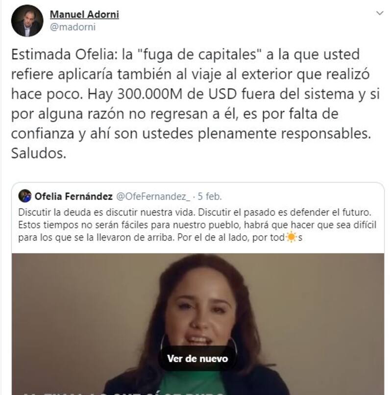 Ante la exposición de Ofelia, el economista Manuel Adorni no se guardó nada y la cruzó fuerte. "Estimada Ofelia: la 'fuga de capitales' a la que usted refiere aplicaría también al viaje al exterior que realizó hace poco. Hay US$ 300.000 M fuera del sistema y si por alguna razón no regresan a él, es por falta de confianza y ahí son ustedes plenamente responsables. Saludos", le expresó en la misma red social. El economista se refirió al viaje de Ofelia con su pareja a Madrid, en el marco de una invitación del partido español Podemos.