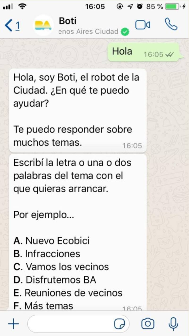 Los porteños ahora pueden chatear con "Boti , un robot de la Ciudad de Buenos Aires a través de Whatsapp, para hacer diversas consultas y recibir información útil sobre trámites y eventos. Este nuevo canal de atención al vecino es gratuito y estará disponible las 24 horas los 365 días del año.