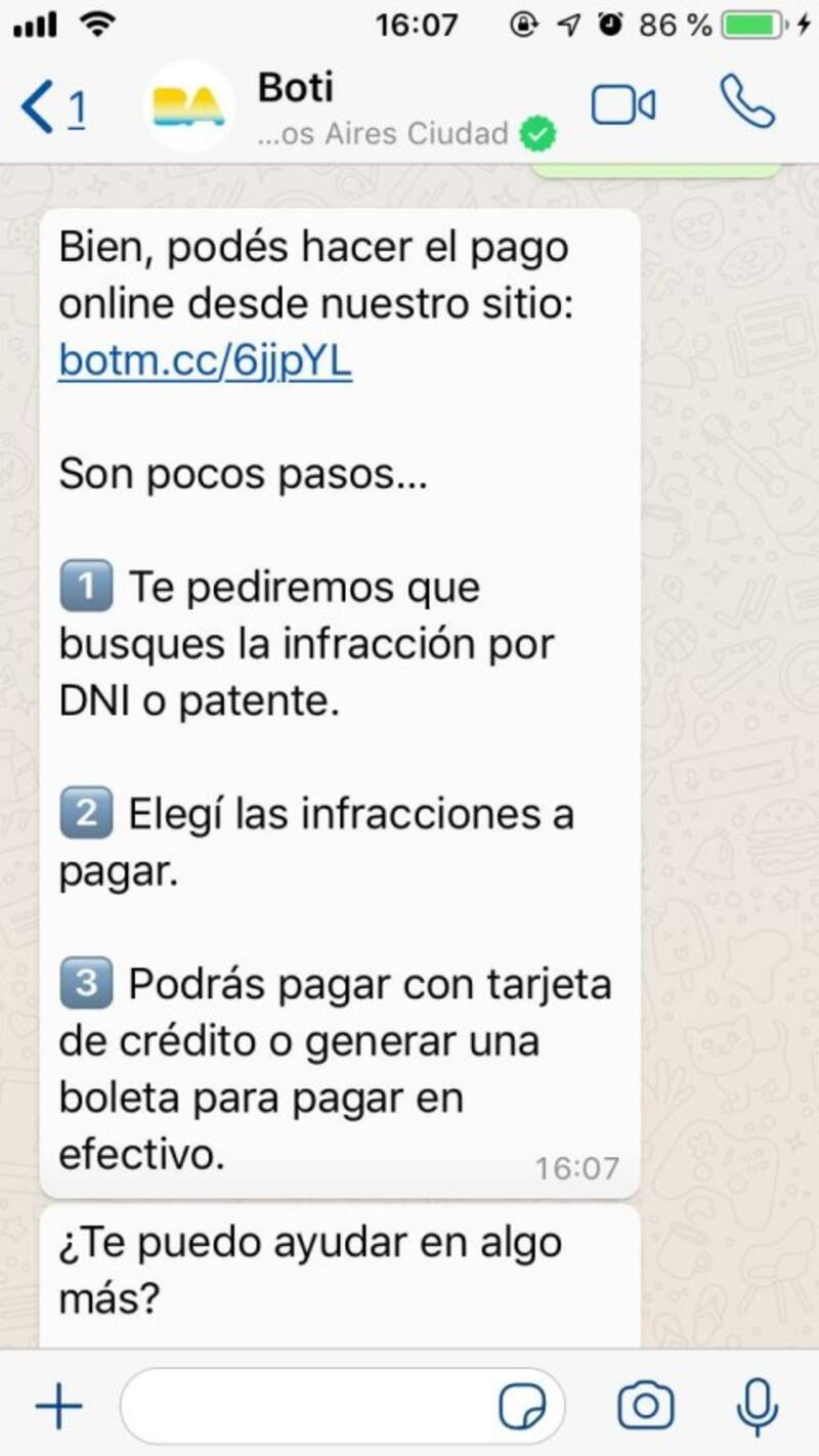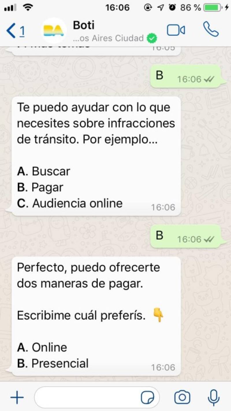Luego de elegir un tópico, el sistema guía con preguntas estructuradas y respuestas preconfiguradas para brindar información en tiempo real. Por ejemplo en el caso de las infracciones, las personas podrán consultar si tienen o no. Así, podrán pedir un libre de deuda en caso de que no, o recibir un link para pagar en caso de que sí.