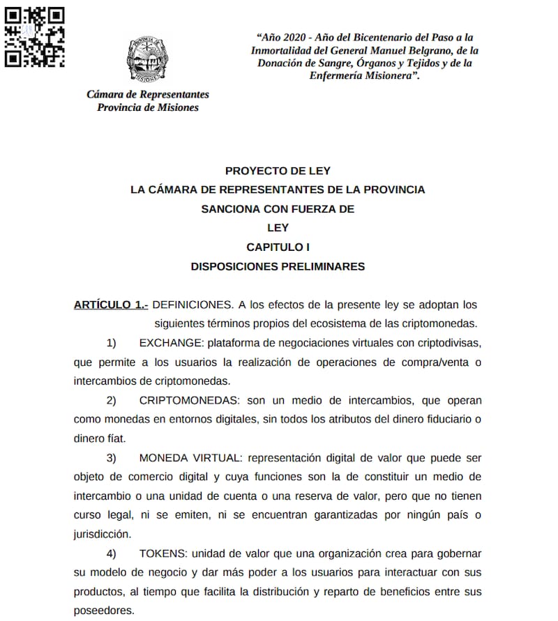 En este nuevo y creciente interés de los gobiernos por las criptomonedas, aparece un proyecto de ley presentado por el diputado provincial Roque Gervasoni, de Misiones, Argentina, que busca crear en esa provincia un exchange de bitcoin y criptomonedas. Este mercado será “descentralizado con participación estatal mayoritaria bajo la forma de una sociedad anónima . En caso de aprobarse esta ley, la plataforma también servirá para custodiar las criptomonedas de sus usuarios, con las que podrán pagarse impuestos, bienes y servicios. Además, “las personas registradas podrán acceder a servicios de préstamos de criptoactivos que solventarán el emprendedurismo misionero , agrega el texto del proyecto.