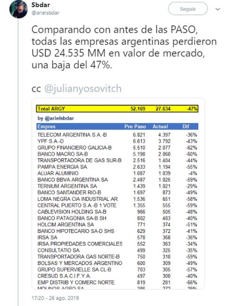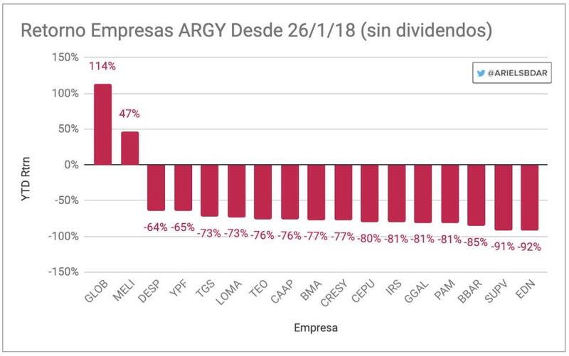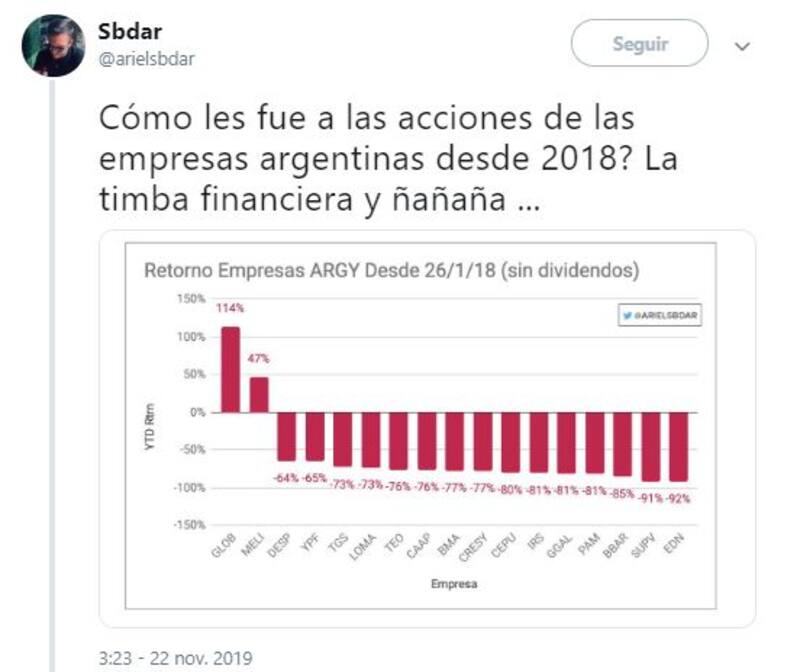 Se conoció un tuit que generó mucha polémica en redes. En el mismo, se puede ver el desempeño de las acciones argentinas desde 2018. Entre la lista, aparecen las grandes tecnológicas como Globant, Despegar y Mercado Libre pero también otras como YPF, Loma Negra o TGS. El resultado del análisis es lapidario: todas en caída, que van del 60% hasta el 90%.