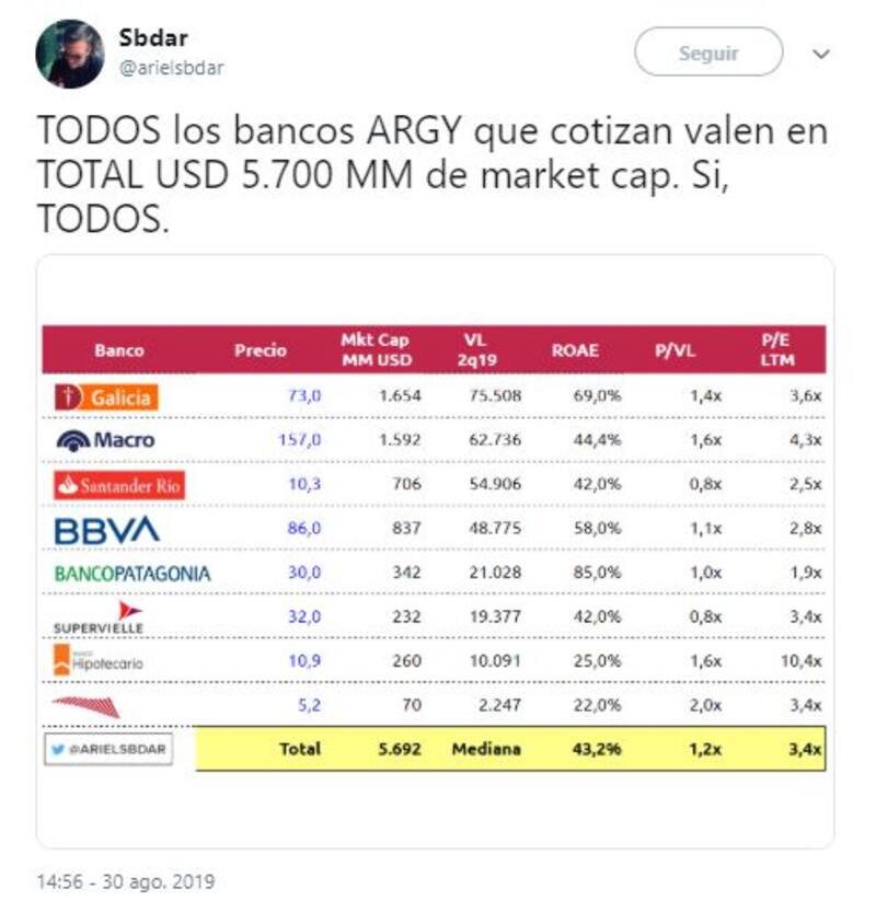 Todos los bancos argentinos valen juntos 5.700 millones de dólares. "Pensemos que solo el FMI debe desembolsar un tramo del crédito por alrededor de 5.500 millones de dólares en las próximas semanas, es decir, tanto como el valor de todos los bancos", explica el analista.