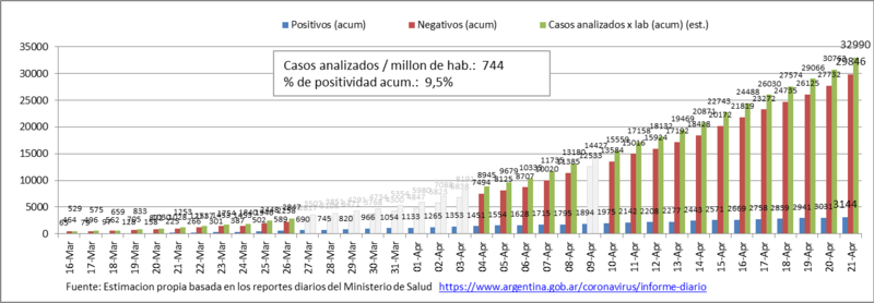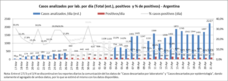 La recopilación de datos denotan cómo se está moviendo la curva de contagios en Argentina: la curva muestra los casos analizados por laboratorio por día, desde el 17 de marzo hasta el 21 de abril. Incluye el total (estimativo) de casos positivos analizados y el porcentaje de diagnósticos positivos en nuestro país.