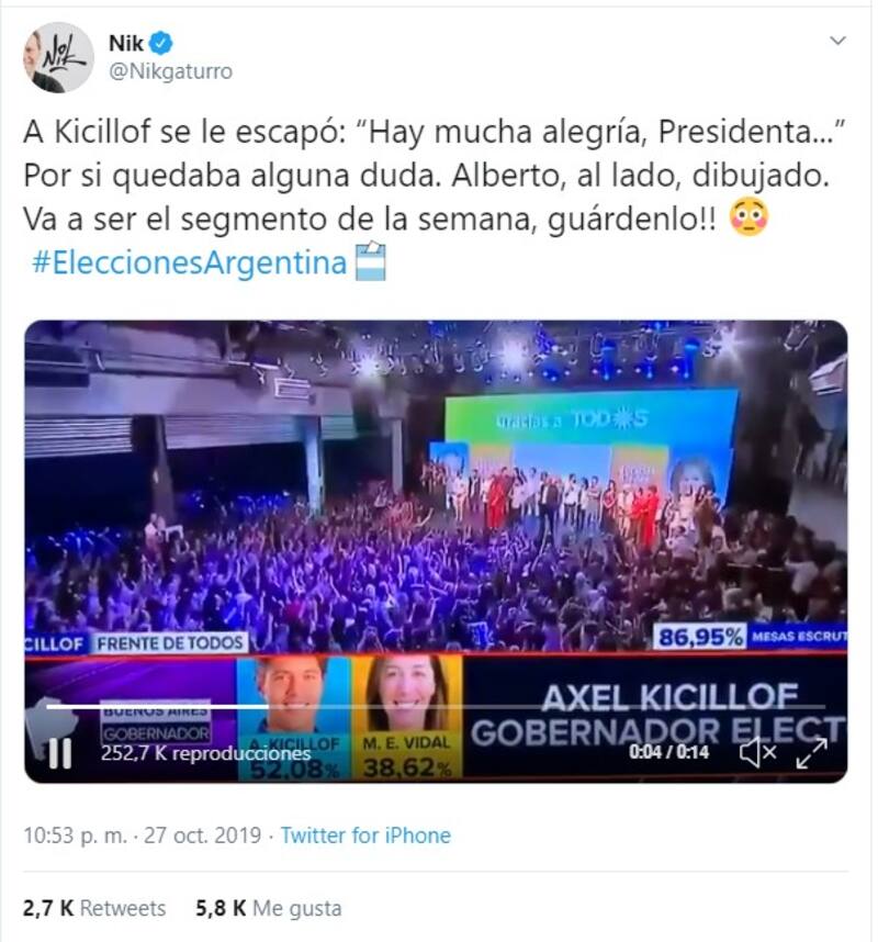 En la publicación, Nik plantea que Alberto está "dibujado" por "si quedaba alguna duda", implicando que en realidad la que gobernará será la vicepresidente elegida y expresidenta.