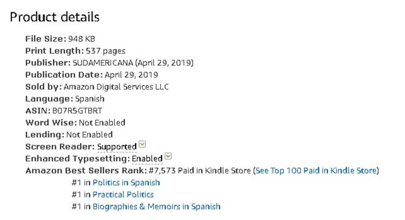 Más allá de esta realidad de corte local, el fenómeno se globalizo de la mano del retailer electrónico Amazon, donde la versión e-book de la publicación ya alcanzó la primera posición en tres categorías: Política en español, Ensayo político (Political practical, en inglés) y Biografías y memorias en español.