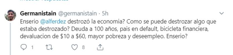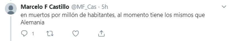 Se trata de Martín Varsavsky que en su cuenta oficial de la red de microblogging (@martinvars) posteó: Primero @alferdez destrozó la economía argentina, luego fracasó en controlar la pandemia y ahora Argentina es el sexto país del mundo por número de muertes.