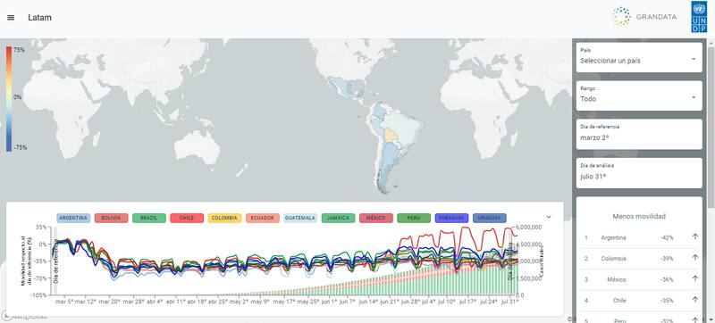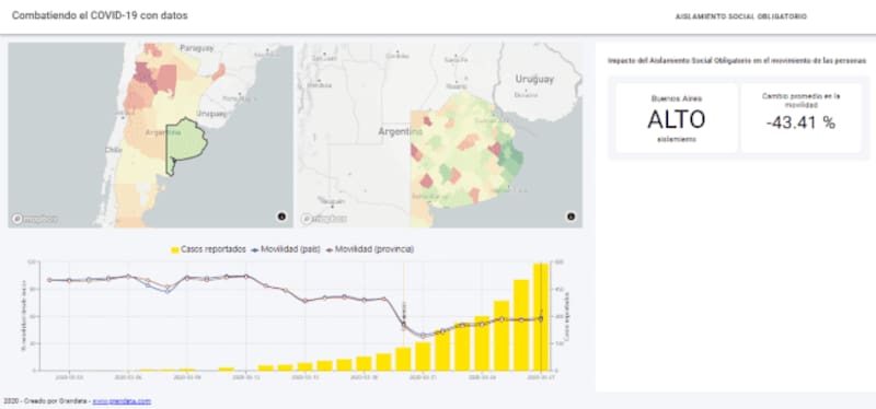 Grandata es una compañía dedicada a aplicar big data a las relaciones sociales: utilizan bases de datos anónimas de proveedores para predecir el comportamiento de las personas. Esta compañía realizó un estudio para saber si la población de nuestro país cumple la cuarentena total. Para esto, conformaron una base de datos de la movilidad antes y durante la cuarentena obligatoria. Encontraron que la movilidad se redujo más de la mitad. La plataforma también se extendió a toda la región LATAM.
