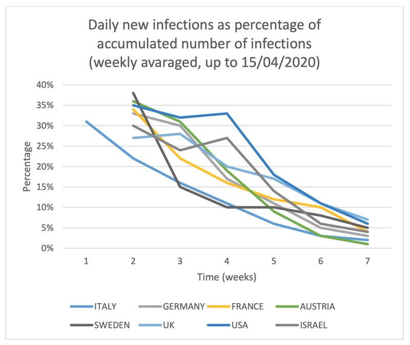 Isaac Ben-Israel compara este patrón con todos los países del mundo a pesar de haberlo descubierto comparando Israel con Estados Unidos. Y luego, añadió Italia a su muestreo. Más allá de las medidas tardías que haya tomado Italia, cuando los datos fueron transpolados a un gráfico, pudo constatar los mismos resultados.