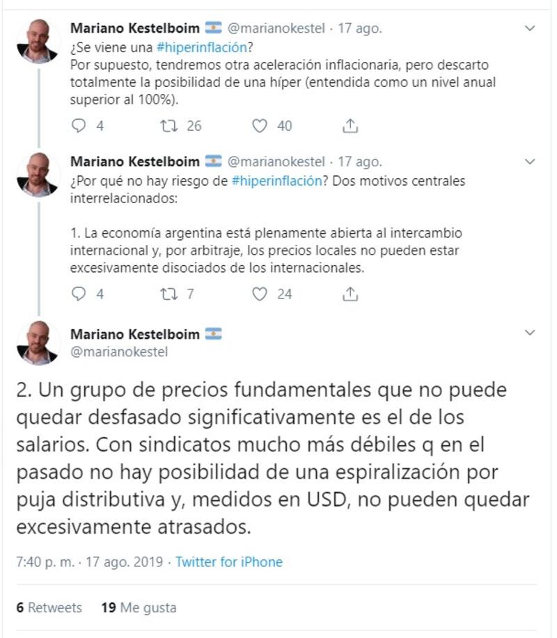 Sin embargo, en otro tuit del día 17, descartó la posibilidad de una hiperinflación aunque sí se dará una "aceleración inflacionaria". Sobre por qué no habrá hiper, en su visión, indicó que "la economía argentina está plenamente abierta al intercambio internacional y, por arbitraje, los precios locales no pueden estar muy disociados de los internacionales"; además, señaló que "con sindicatos mucho más débiles que en el pasado, no hay posibilidad de espiralización por puja distributiva".