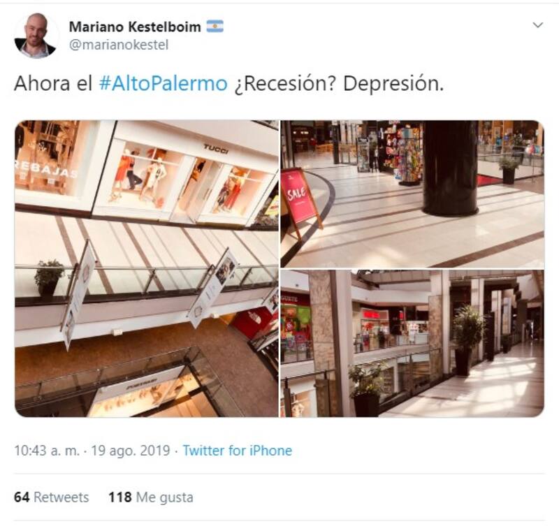 Como una versión gráfica de la crisis actual, a la que categorizó como "depresión" (el lugar de recesión), el pasado lunes (día no laborable) subió fotos del shopping Alto Palermo con muy pocos visitantes.