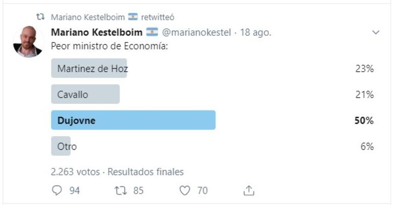 También hizo una encuesta entre sus seguidores sobre cuál fue el peor ministro de Economía (sic) de la Argentina de la historia y ganóNicolás Dujovne con el 50%, dejando atrás a opciones polémicas como José Martínez de Hoz (23%) y Domingo Cavallo (21%).