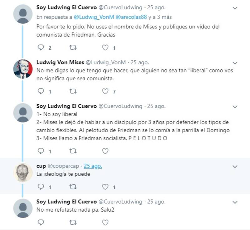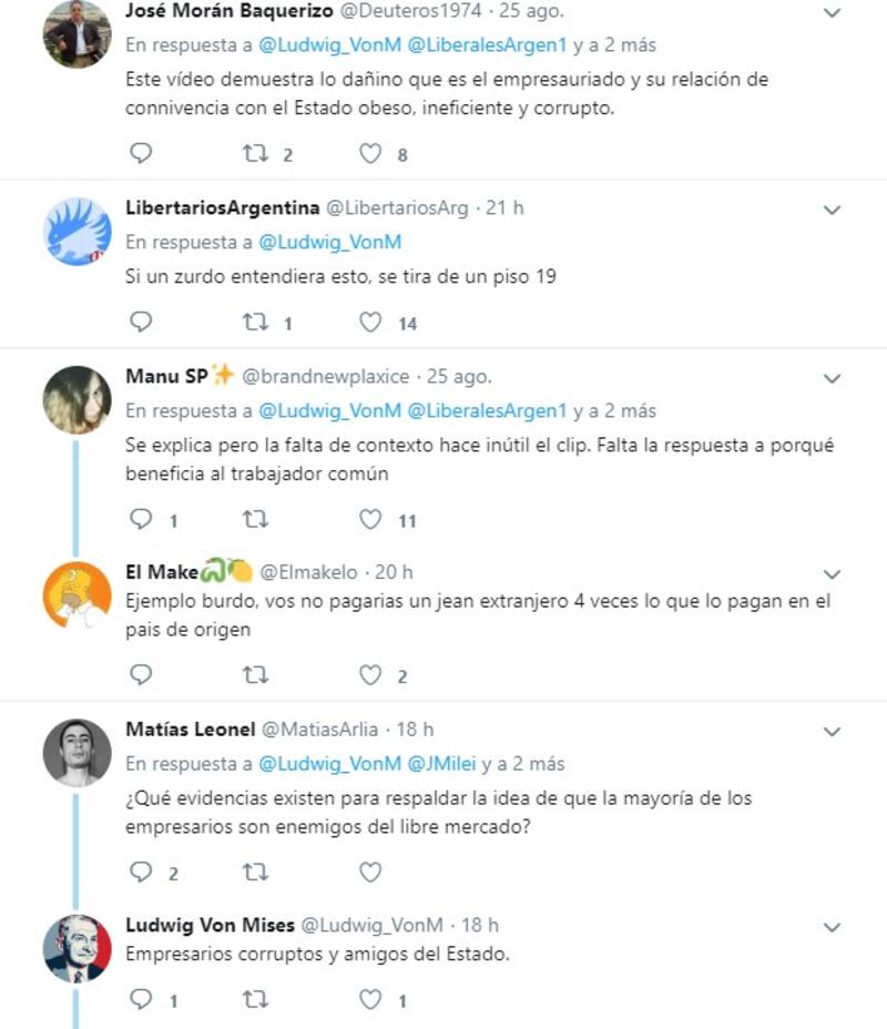 Este posteo derivo en distintos intercambios polémicos entre el usuario llamado Ludwig Vos Mises (por el economista de la Escuela Austríaca del mismo nombre; dentro de esta escuela se encuentran Javier Milei y Diego Giacomini) y otros en la red social.