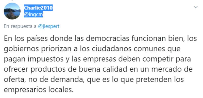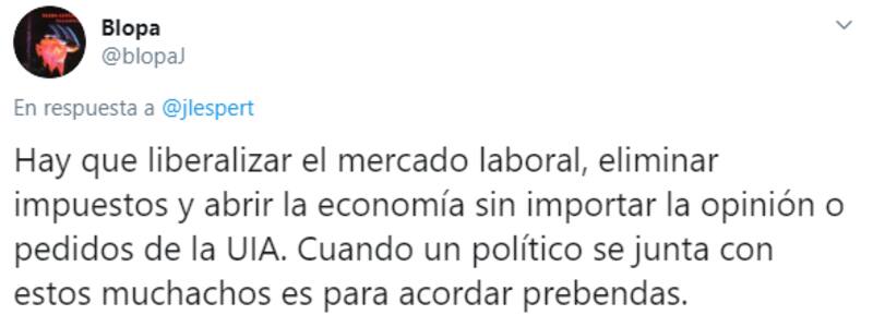 Espert decidió postear en su cuenta personal de Twitter (@jlespert) una dura crítica contra la organización industrial que, rápidamente, generó revuelo entre los usuarios de la red de microblogging.