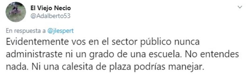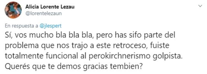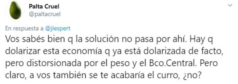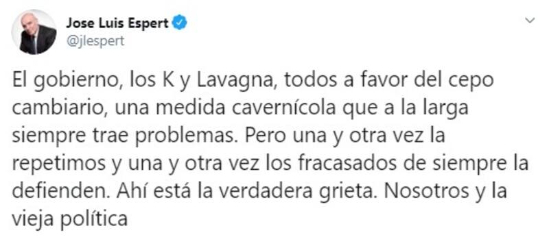 Previamente, Espert también criticó al “Gobierno, los K y Lavagna por expresarse a favor del cepo cambiario, al que definió como “una medida cavernícola que a la larga siempre trae problemas . “Pero una y otra vez la repetimos y una y otra vez los fracasados de siempre la defienden. Ahí está la verdadera grieta. Nosotros y la vieja política , posteó.
