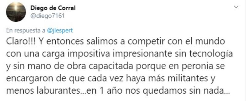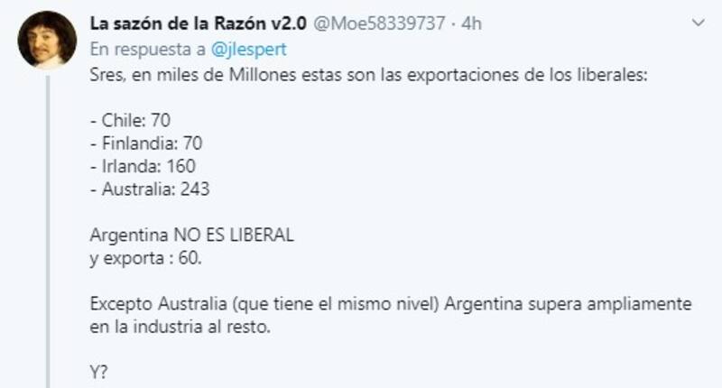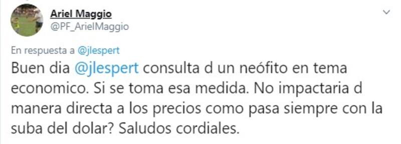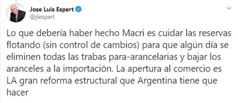 “Lo que debería haber hecho Macri es cuidar las reservas flotando (sin control de cambios) para que algún día se eliminen todas las trabas para-arancelarias y bajar los aranceles a la importación. La apertura al comercio es LA gran reforma estructural que Argentina tiene que hacer , posteó Espert en su cuenta personal de Twitter.