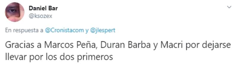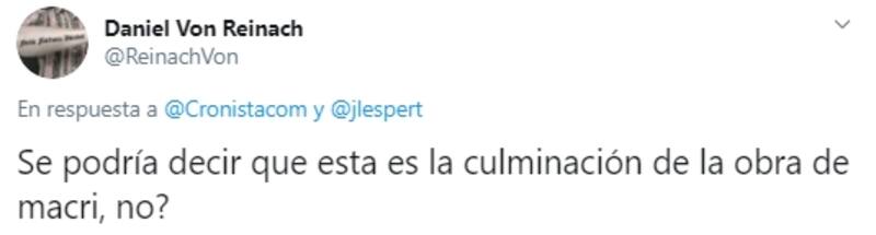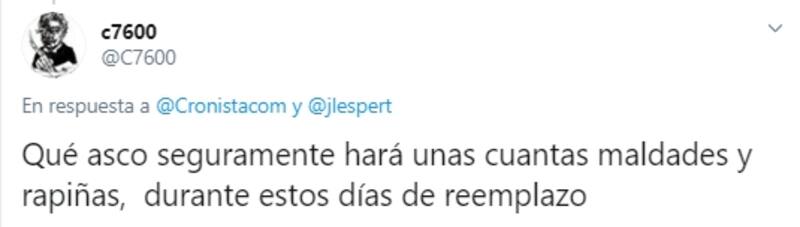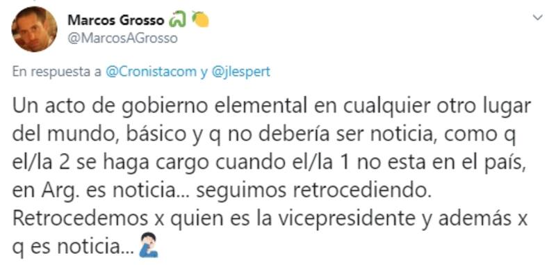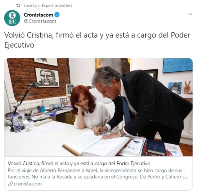 En esta ocasión, en su cuenta personal de la red de microblogging (@jlesper) retuiteó una nota publicada en el sitio web de El Cronista titulada “Volvió Cristina, firmó el acta y ya está a cargo del Poder Ejecutivo"