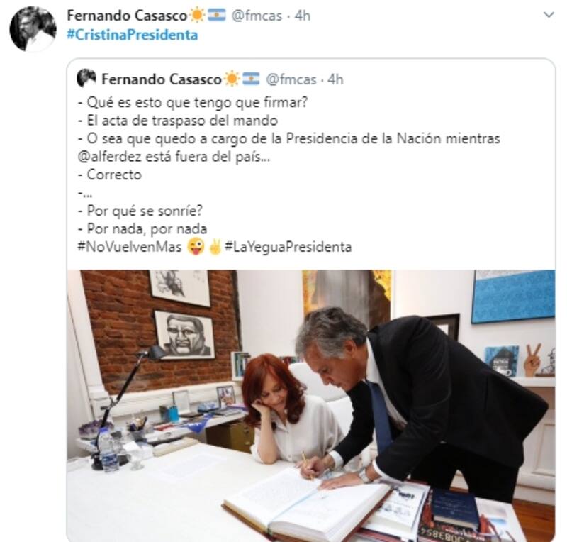 De forma irónica, el economista reiteró en la publicación el títiulo de la nota para resaltar que la expresidente nuevamente vuelve a ser quién está al frente del país.