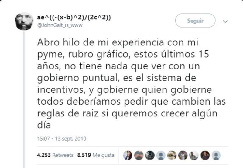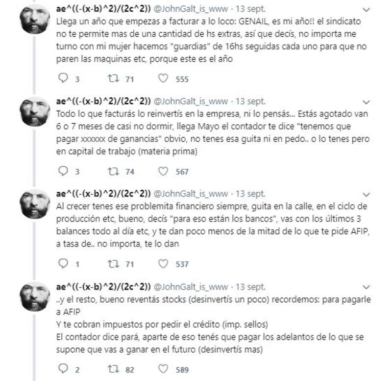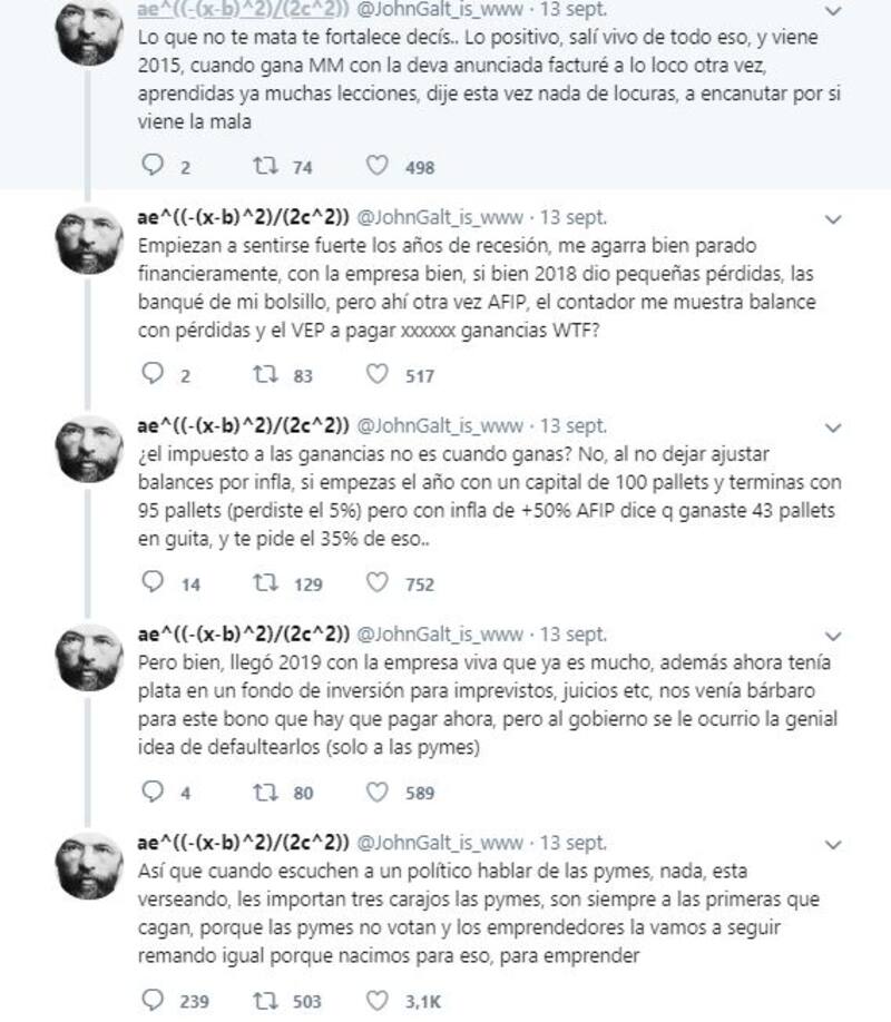 El autor del post está especialmente enojado con el pago de impuesto a las ganancias. Sin embargo, la historia sigue y el foco ahora pasa al tema de importaciones. Particularmente, en lo que concierne a las trabas burocráticas para operar. Finalmente, el usuario cerró el hilo comn "Así que cuando escuchen a un político hablar de las pymes, nada, esta verseando", dijo en ese mismo hilo.