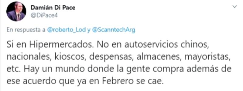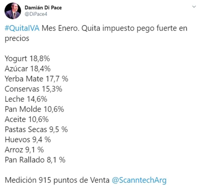 Se trata de Damián di Pace, que en su cuenta personal en la red de microblogging (@DiPace4) enfatizó que la quita del impuesto pegó fuerte en los precios, a partir de una medición realizada en 915 puntos de venta por la empresa proveedora de tecnología e información Scanntech Argentina.