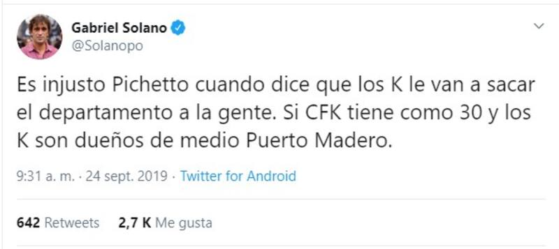En este sentido, Solano marcó que "es injusto Pichetto cuando dice que los K le van a sacar el departamento a la gente. Si CFK tiene como 30 y los K son dueños de medio Puerto Madero".