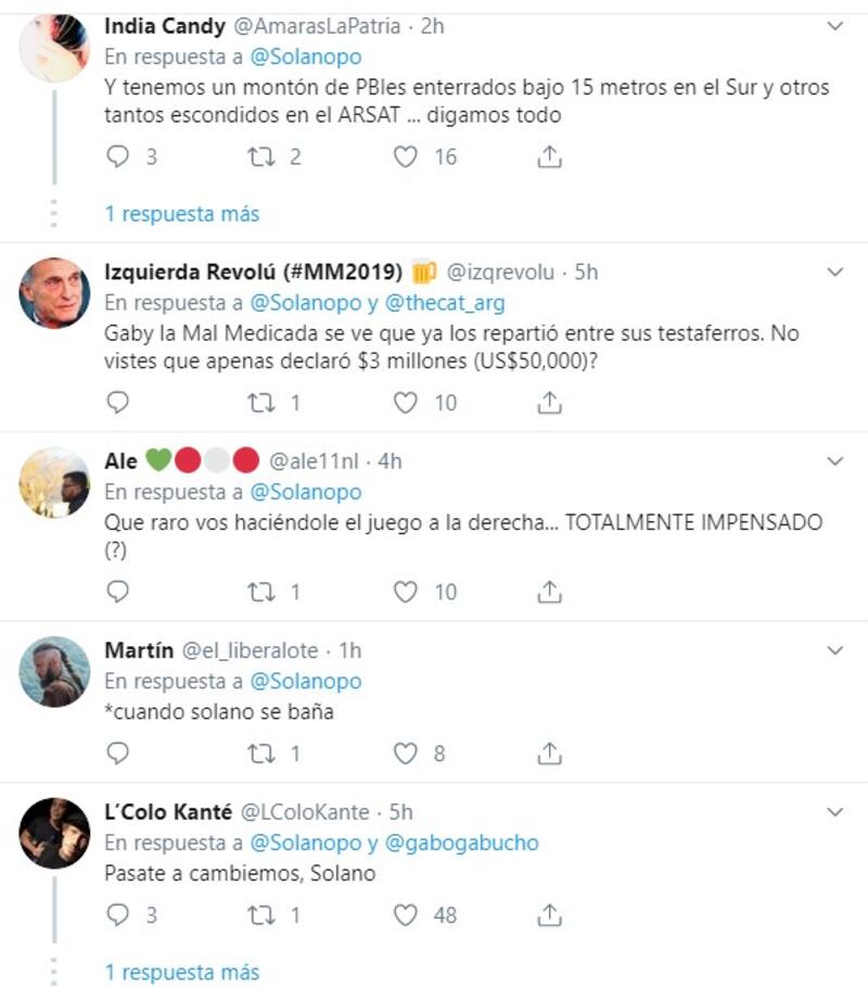 El tuit de Solano obtuvo mas de 600 retuits y casi 3.000 "me gusta". Sin embargo, la reacción fue variada: hubo quienes lo acusaron de "operar para derecha" mientras que otros, del otro lado de la grieta, lo felicitaron y hasta le ofrecieron pasarse "al pichettismo".
